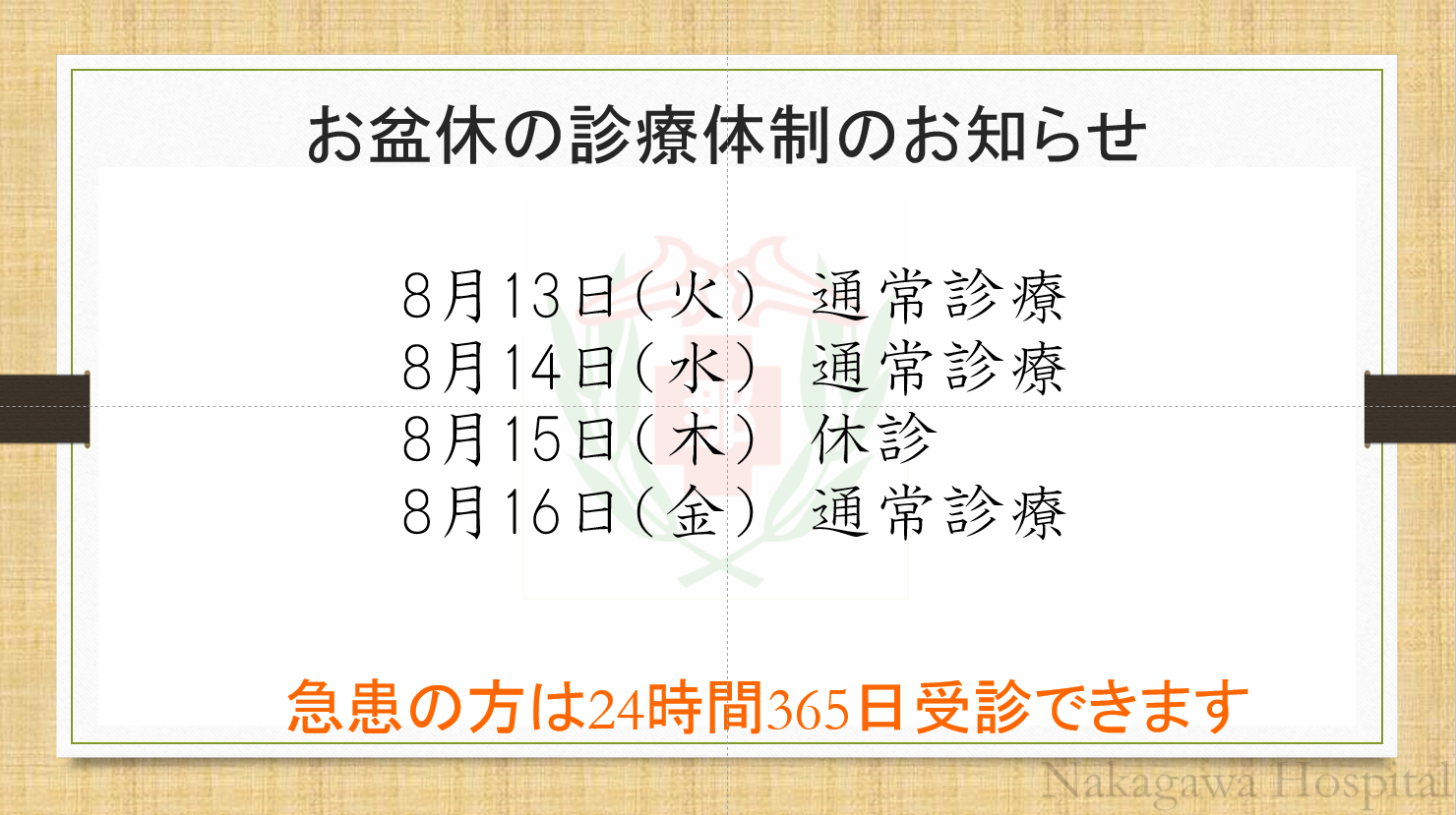 お盆の診療体制のお知らせ